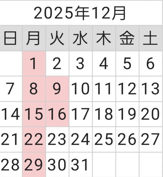 おはようございますかずです。 今日から12月スタート 赤印がお休みになります。 年末は混み合いますので、 ご希望日時がお決まりでしたら、 お早めのご予約を強くおすすめ致します。 なお12月最後の月曜日は毎年営業でしたが、 これからはお休みになります。